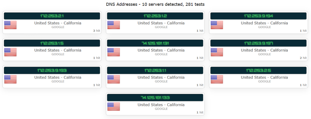 當本機所在地區(qū)出現(xiàn)在檢測列表中時,即表示DNS已經(jīng)泄漏。
