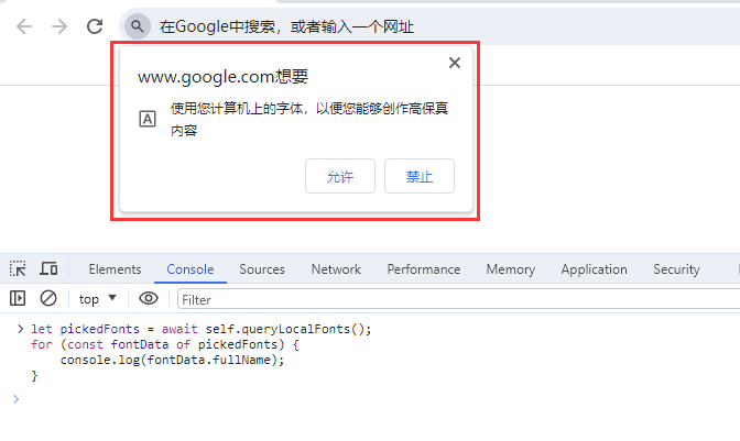 瀏覽器JavaScript? API:window.queryLocalFonts() 方法,用于查詢本地系統(tǒng)中可用的字體列表,返回所有本地可用字體,即電腦上所有安裝的所有字體。