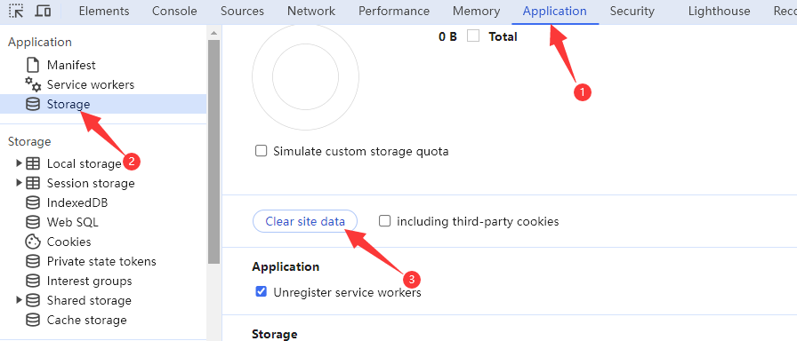 如果扔無法解決,按F12打開瀏覽器開發(fā)者工具,然后切換到 Application選項卡,左側(cè)選擇 Storage菜單,點擊 Clear site data ,之后重試。